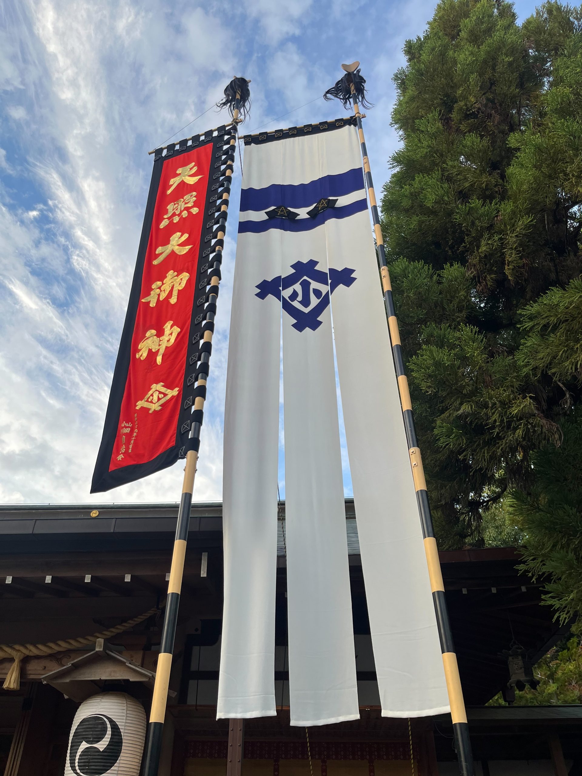 伊射奈岐神社 秋祭 太鼓神輿巡幸 お知らせ 2025.10.19 10月12日(日)伊射奈岐神社 秋祭 太鼓神輿巡幸が行われました。 あいにくのにわか雨にも見回られ曇天の中でしたが、最後まで執り行うことが出来ました。 自治会役員の皆様には朝早くからの幟の設置や昼食場所の設営などご協力いただきありがとうございました。 来年も同様に執り行われることを願ってまたのご協力お願いいたします。 また、幟と吹き流しの修繕、新調をしました。きれいで立派な幟と吹き流しです。